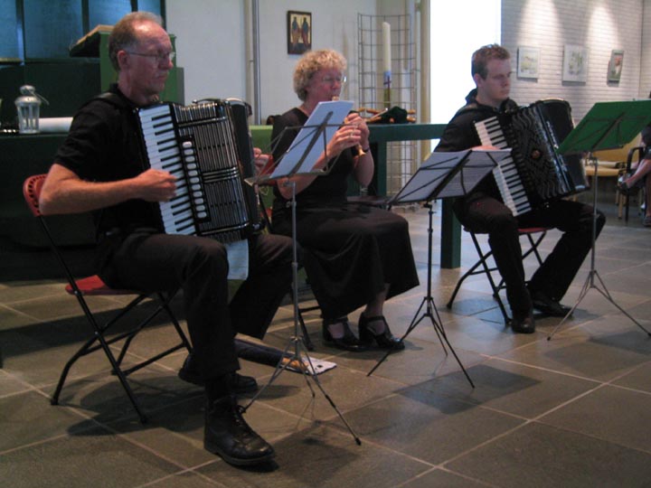 Tijdens de zomerweken is elke dinsdagavond op het plein in Julianadorp vanaf 19.00 uur het pleinfeest. De commissie O2 van de ontmoetingskerk op het plein organiseert op deze dinsdagavonden een concert van 20.00 uur tot ongeveer 21.00 uur. Op deze avond zong het koor van O2, zong Karin Berbee (en haar zus) met gitaarbegeleiding, en speelden onze leden van Accordeonola, Michel, Tineke en Martijn, op Accordeon en fluit (en niet op trompet zoals in de krant stond).
